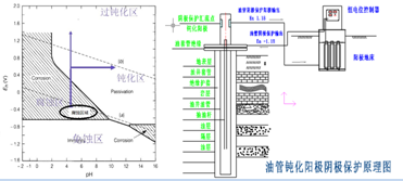 實(shí)施方法是用恒電位儀中的保護(hù)電路,控制由油管桿和套管構(gòu)成的宏觀陰極保護(hù)電路,管道是陰極保護(hù)的負(fù)極收到保護(hù),鈍化陽(yáng)極安裝在液體中形成一個(gè)保護(hù)回路。在這個(gè)防腐電池場(chǎng)中管道作為陰極得到保護(hù),鈍化陽(yáng)極成為消耗材料。